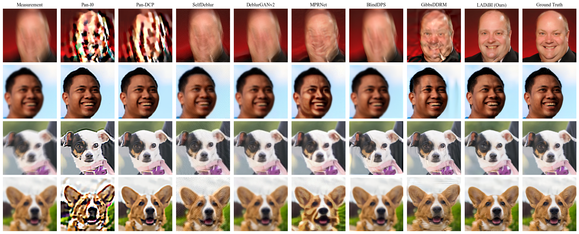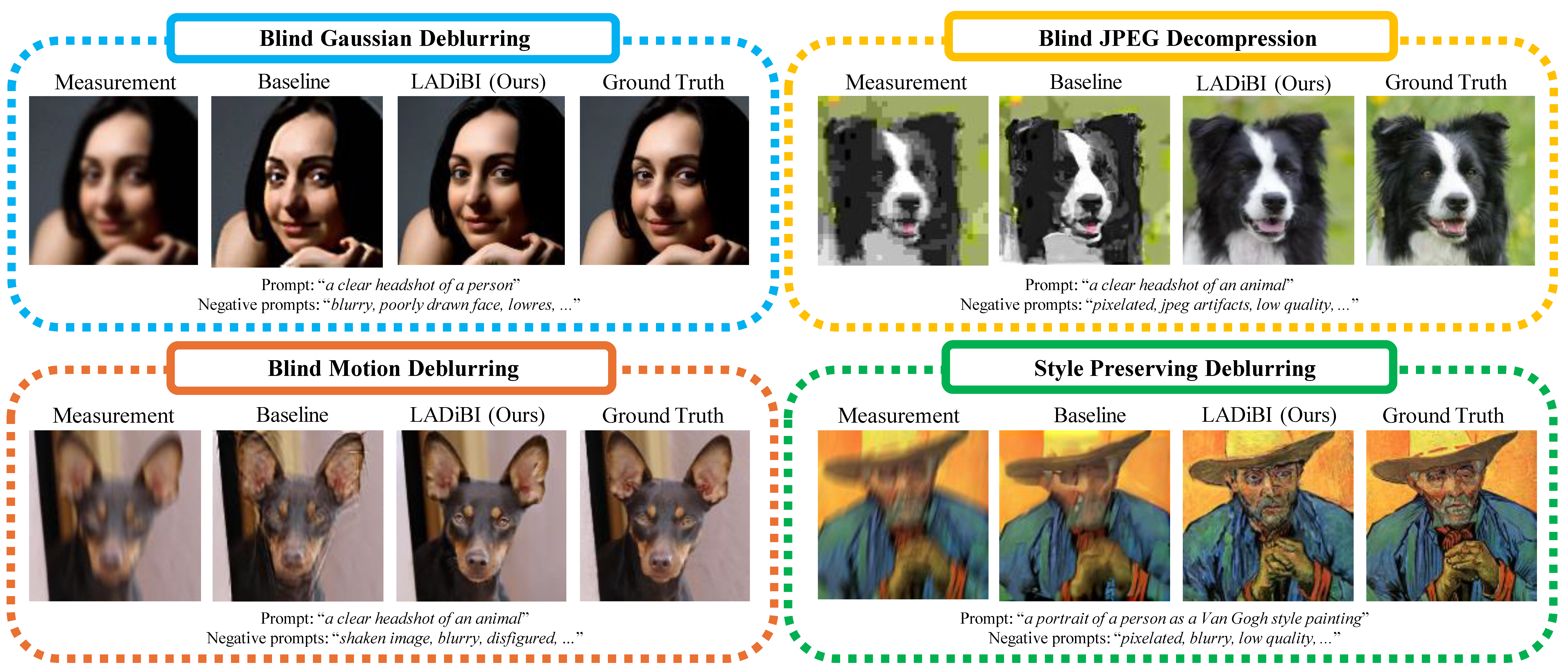 Blind inverse problems, where both the target data and forward operator are unknown, are crucial to many computer vision applications. Existing methods often depend on restrictive assumptions such as additional training, operator linearity, or narrow image distributions, thus limiting their generalizability. In this work, we present LADiBI, a training-free framework that uses large-scale text-to-image diffusion models to solve blind inverse problems with minimal assumptions. By leveraging natural language prompts, LADiBI jointly models priors for both the target image and operator, allowing for flexible adaptation across a variety of tasks. Additionally, we propose a novel posterior sampling approach that combines effective operator initialization with iterative refinement, enabling LADiBI to operate without predefined operator forms. Our experiments show that LADiBI is capable of solving a broad range of image restoration tasks, including both linear and nonlinear problems, on diverse target image distributions.